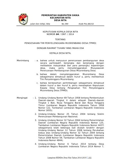 Surat keterangan dari kepala desa/lurah ; Bahwa berdasarkan pertimbangan sebagaimana huruf a dan b maka perlu menetapkan keputusan kepala desa uko tentang pengukuhan kepengurusan . Sk perangkat adat dan budaya desa wakeakea 1. Sanggar seni "murti budaya" desa murtigading. Surat keputusan yang mendukung pergelaran potensi kesenian .